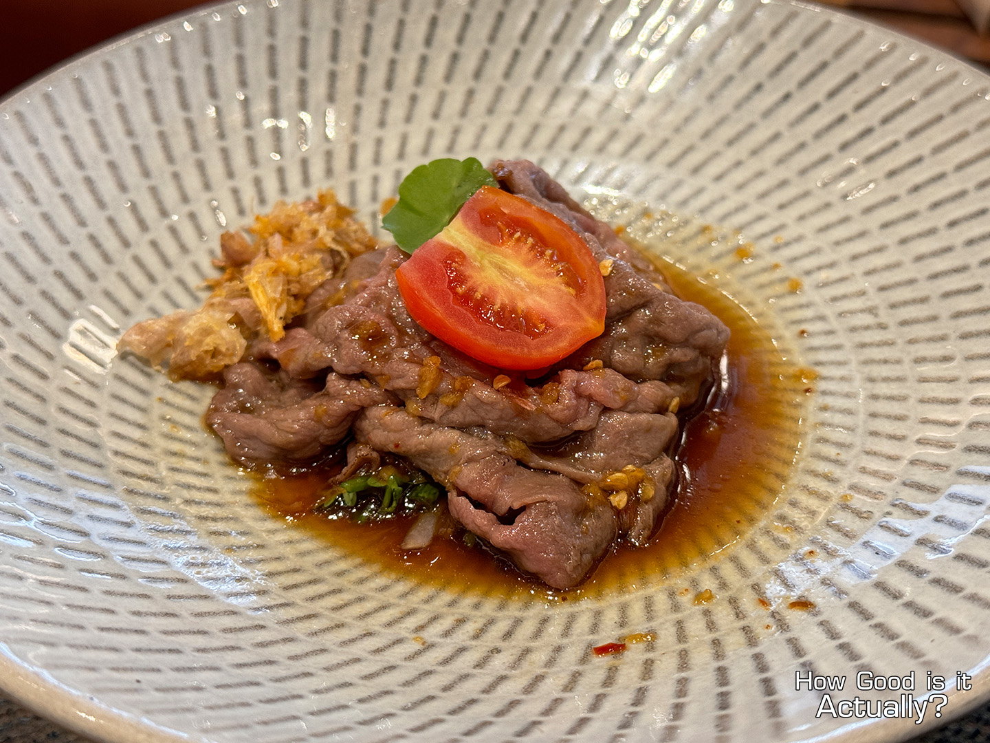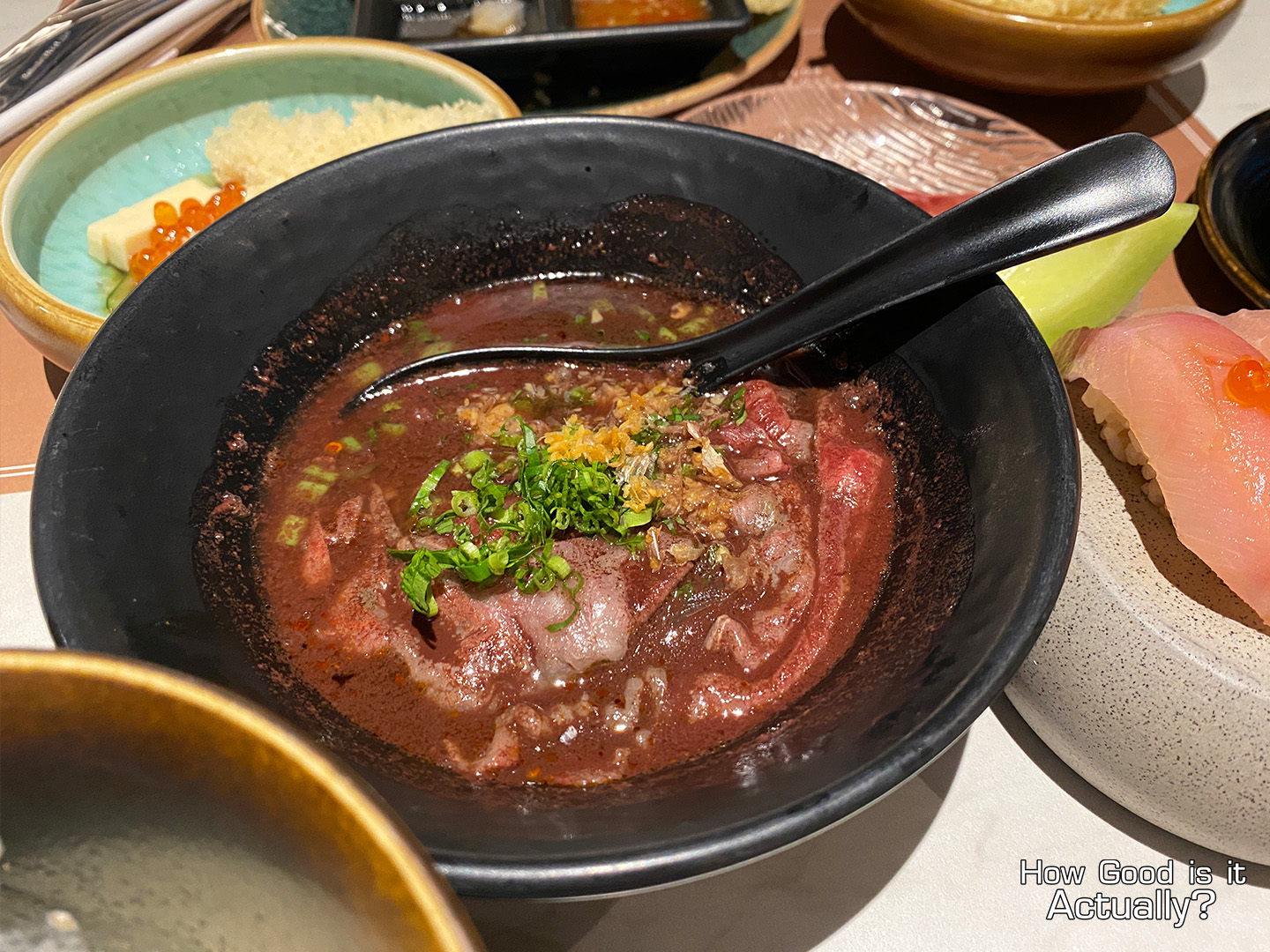 How you eat this… is up to you. I assume the traditional way is to swirl the sushi up by the rice (like a whirlpool) and then eat it in a single bite. But as for my method? (And put your pitchforks down…) I prefer to slice the beef by the ends a bit, enjoy the sides, then pick up the rest of the sushi for a more wieldable experience.