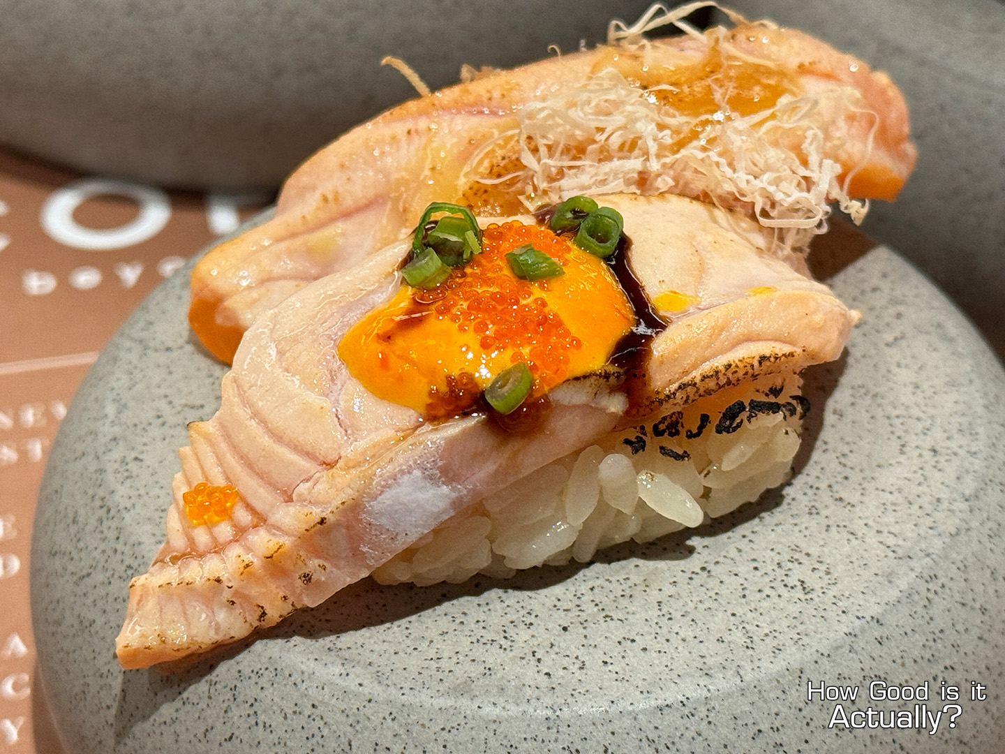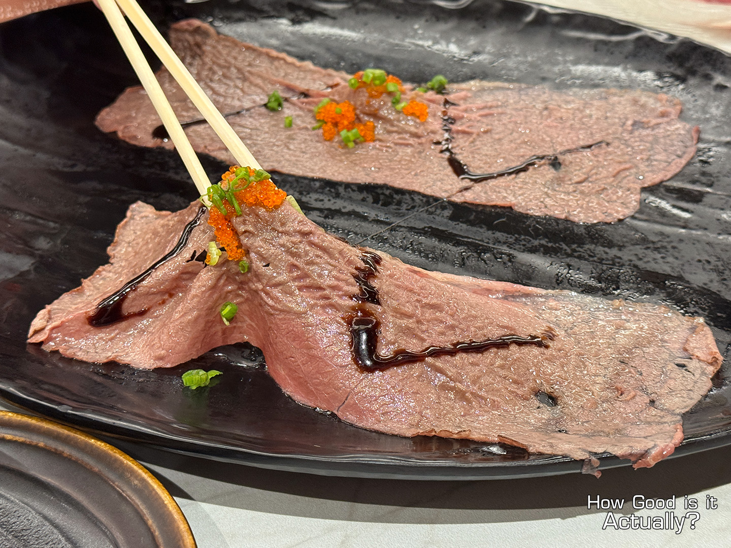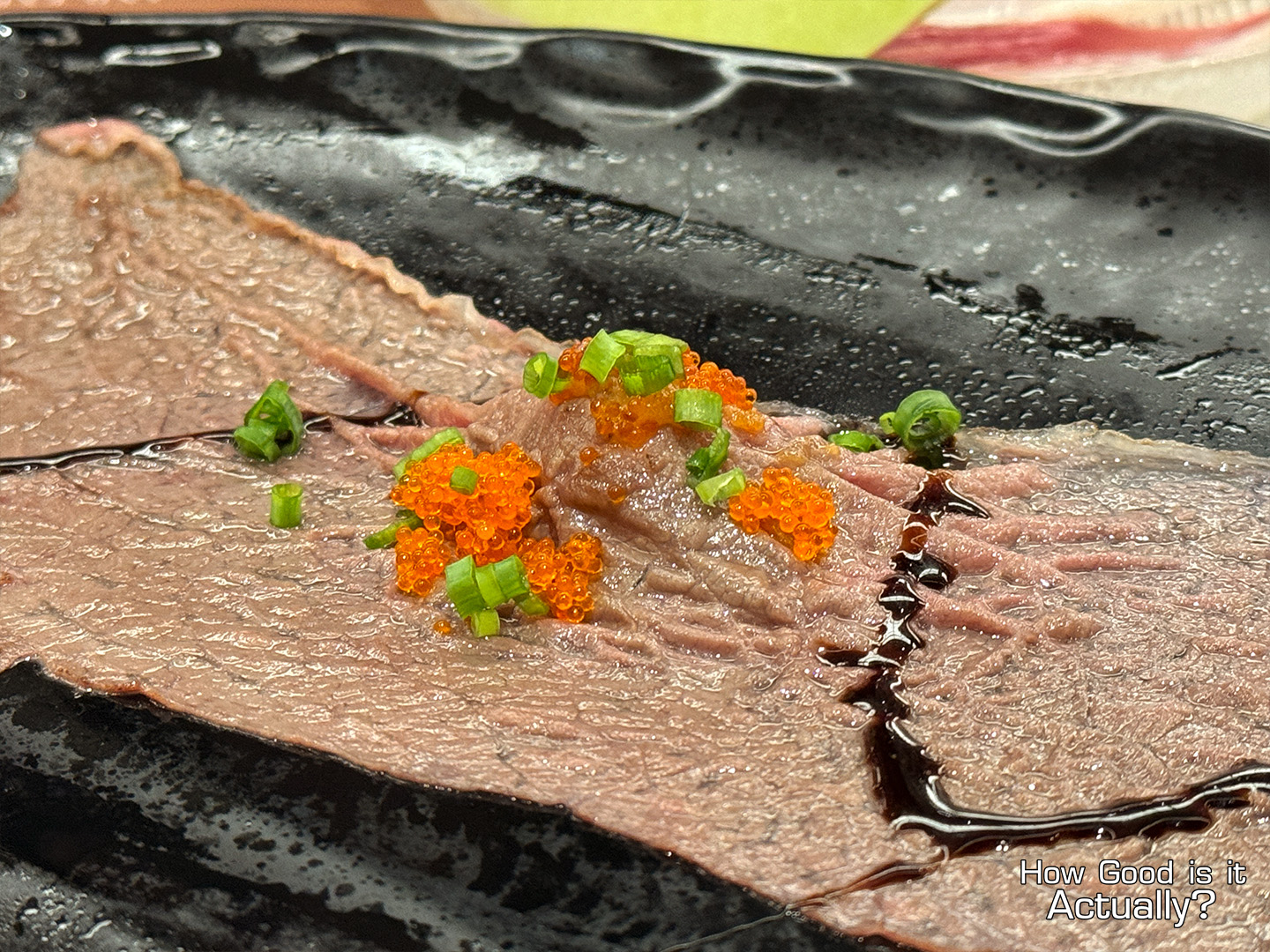 A massive slice of lightly seared Australian Wagyu, served on a comically standard bit of rice, topped with some sweet soy sauce, Tobiko, and Green Onions.