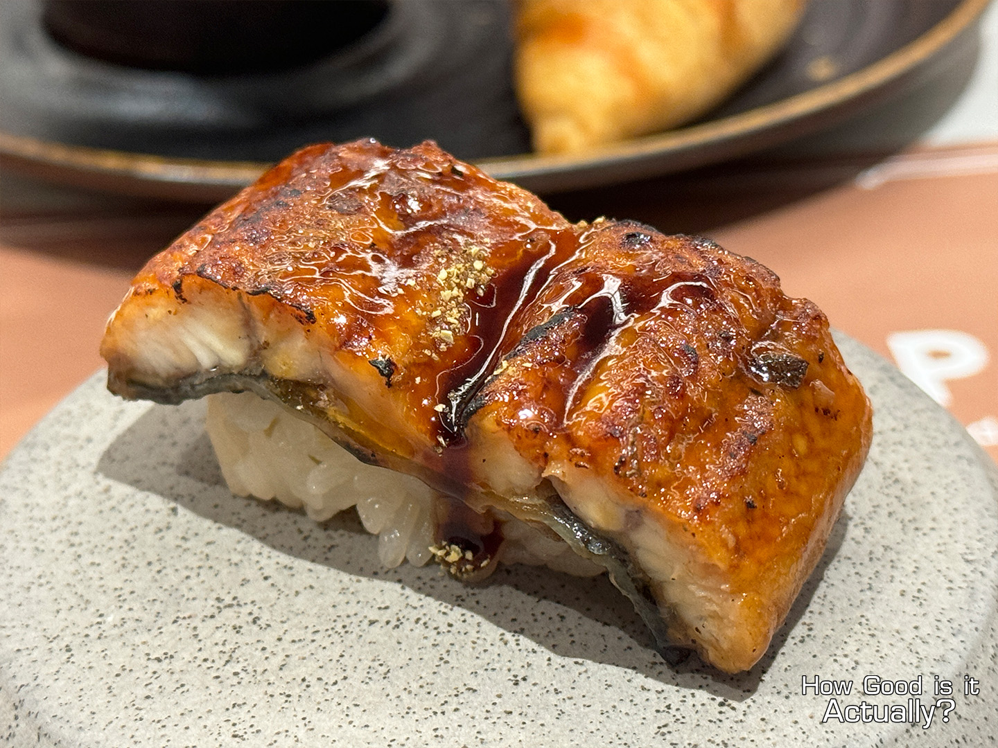 Lightly torched, topped with Unagi sauce and a dash of Sansho Pepper for some citrusy kick.