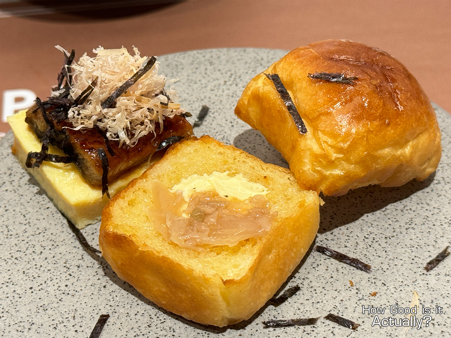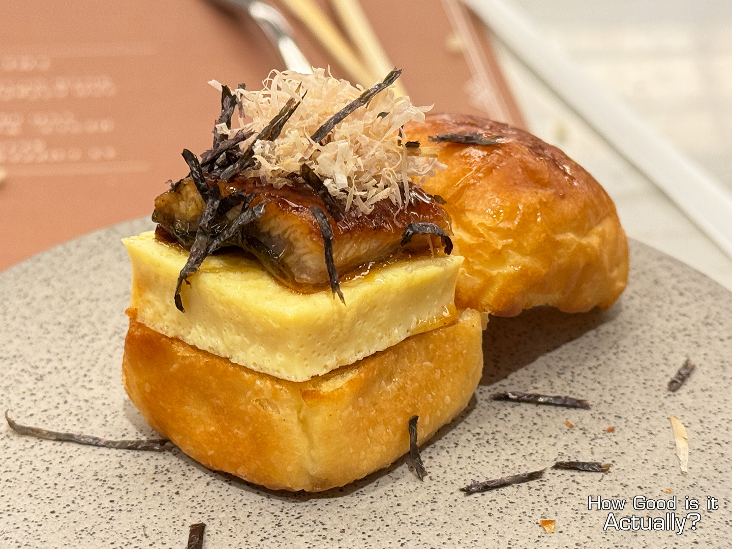 One of the newer items on the menu, featuring Unagi, a Steamed Egg-like Omelette, Sauerkraut, and a toasted Brioche Bun, topped with some Nori and Bonito Flakes.