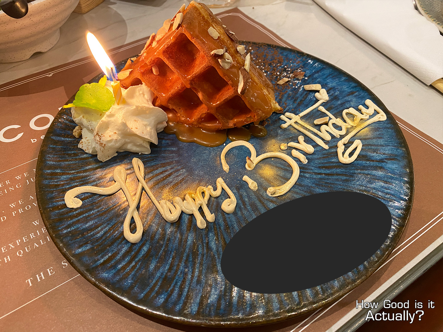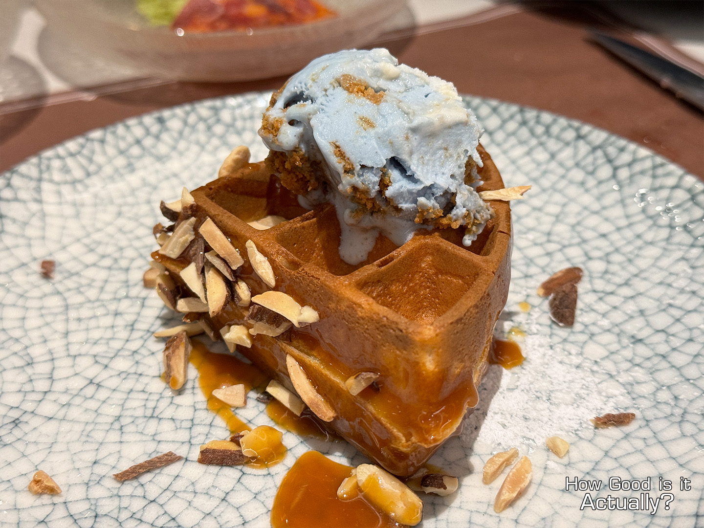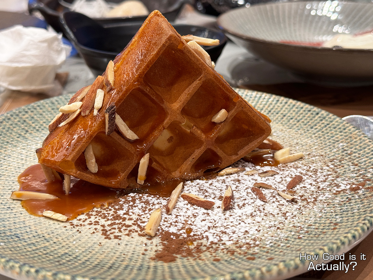 I mean, technically it’s just a waffle with some almonds, caramel sauce, and icing sugar… but all the elements do work together quite well! Big fan of the waffle’s crispy corners and the rich caramel sauce.