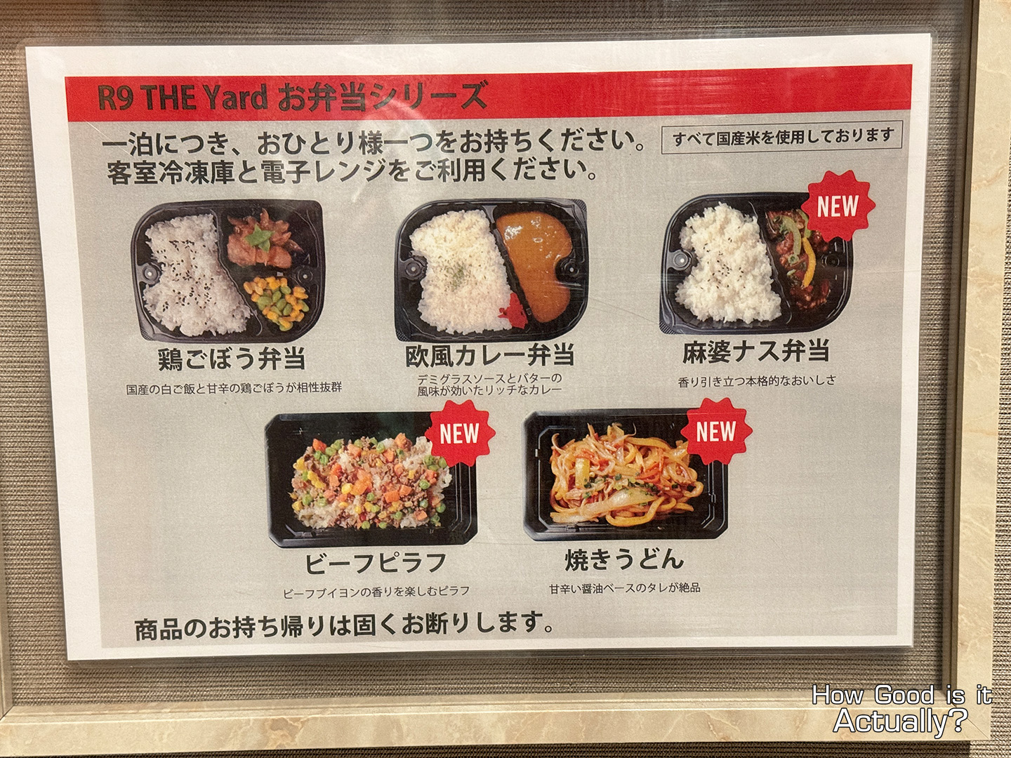 Your options are between: Chicken & Burdock Bento, European-Styled Curry, Mapo Eggplant Bento, Beef Pilaf, and Stir-Fried Udon.