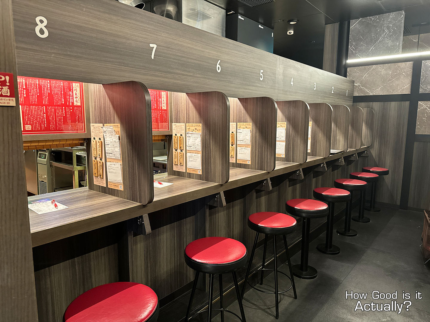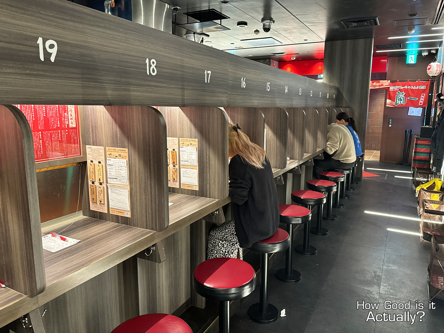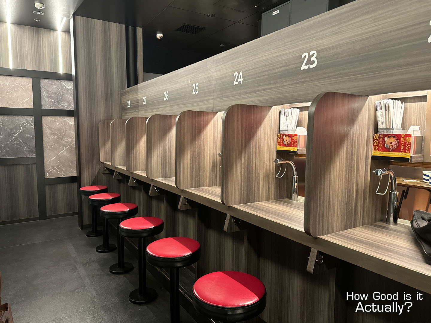 The interior should be very familiar if you’ve ever visited Ichiran before, featuring rows of counter seats and their famous “Flavor Concentration Booths.”