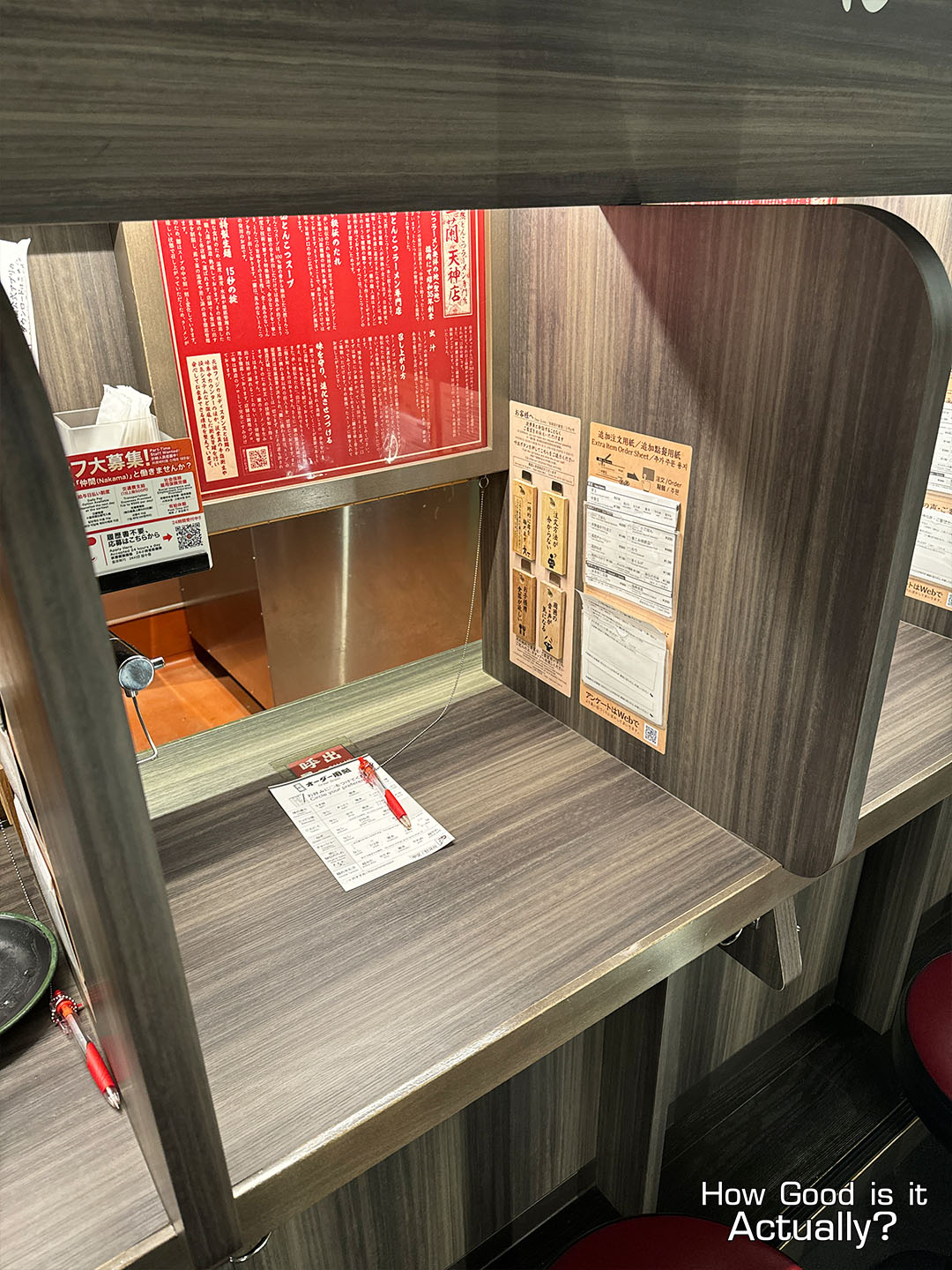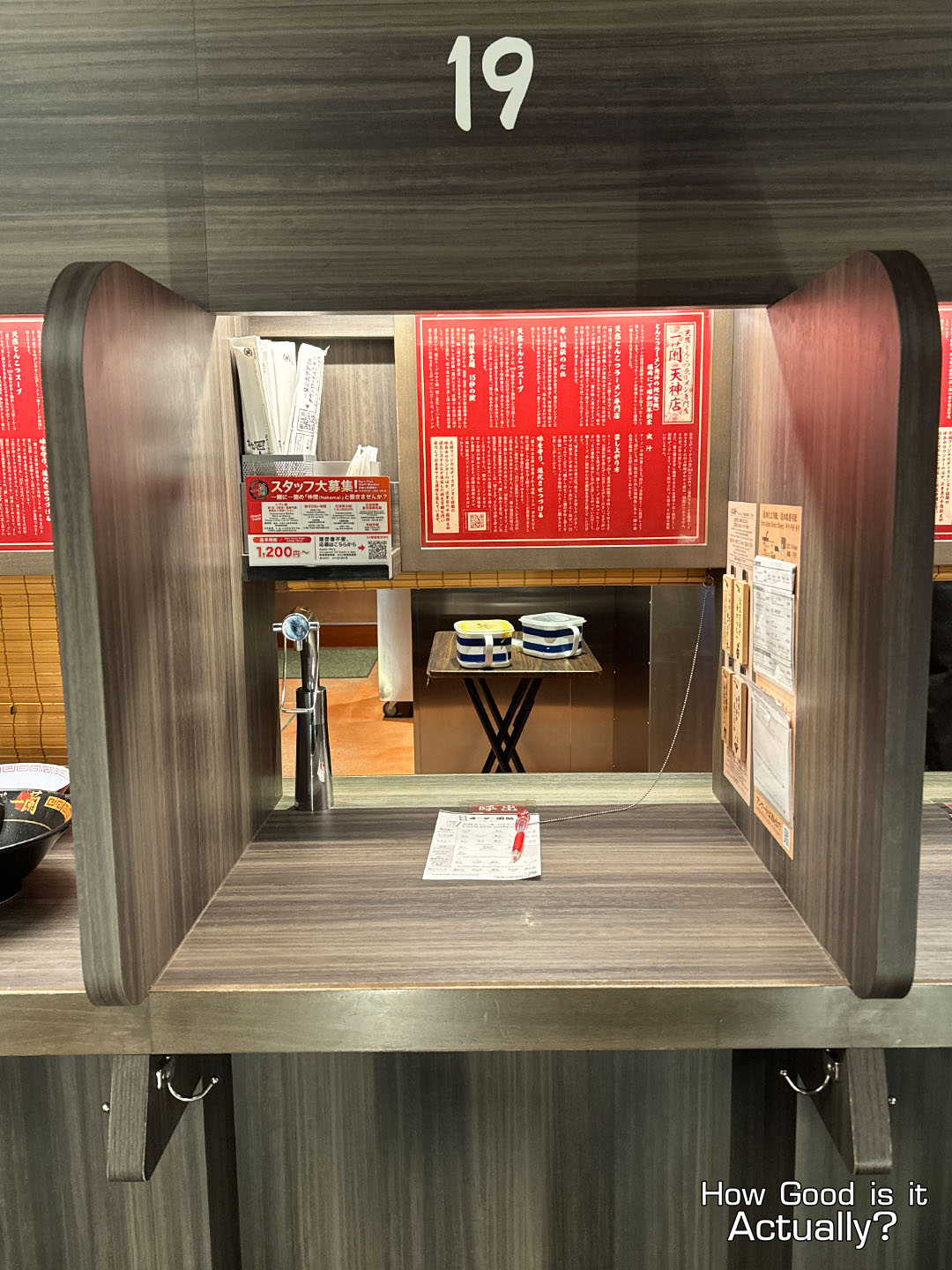 Everything you’ll need is fully self-contained here, from chopsticks, ordering sheet, and a water dispenser & cups by the table, as well as a bag hook below and clothes hanger & tissues right behind. Plus, a set of pre-written blocks for special requests to the staff for a true solo-dining experience.