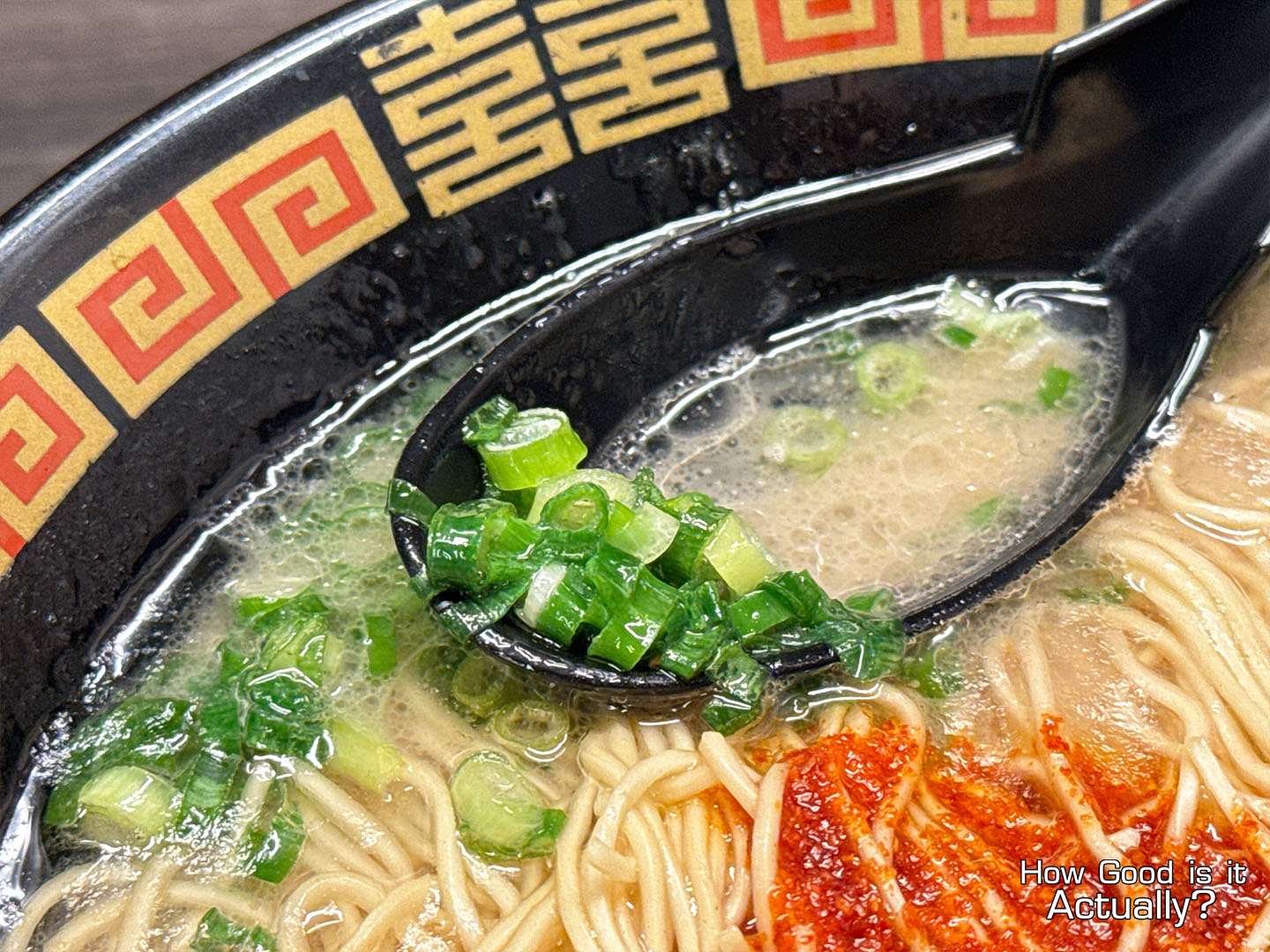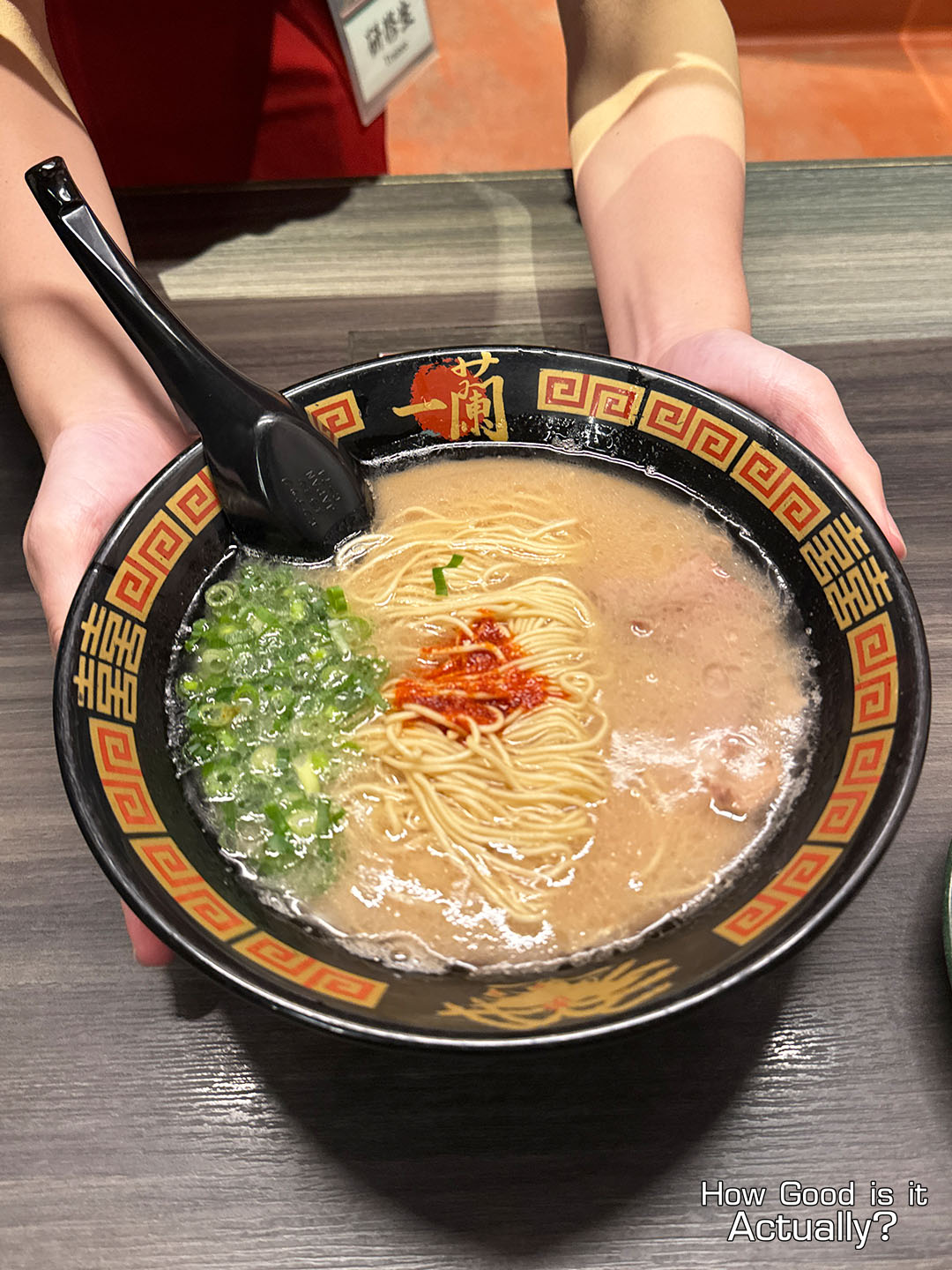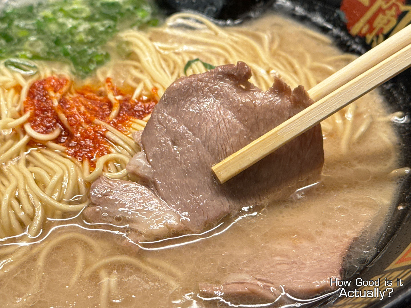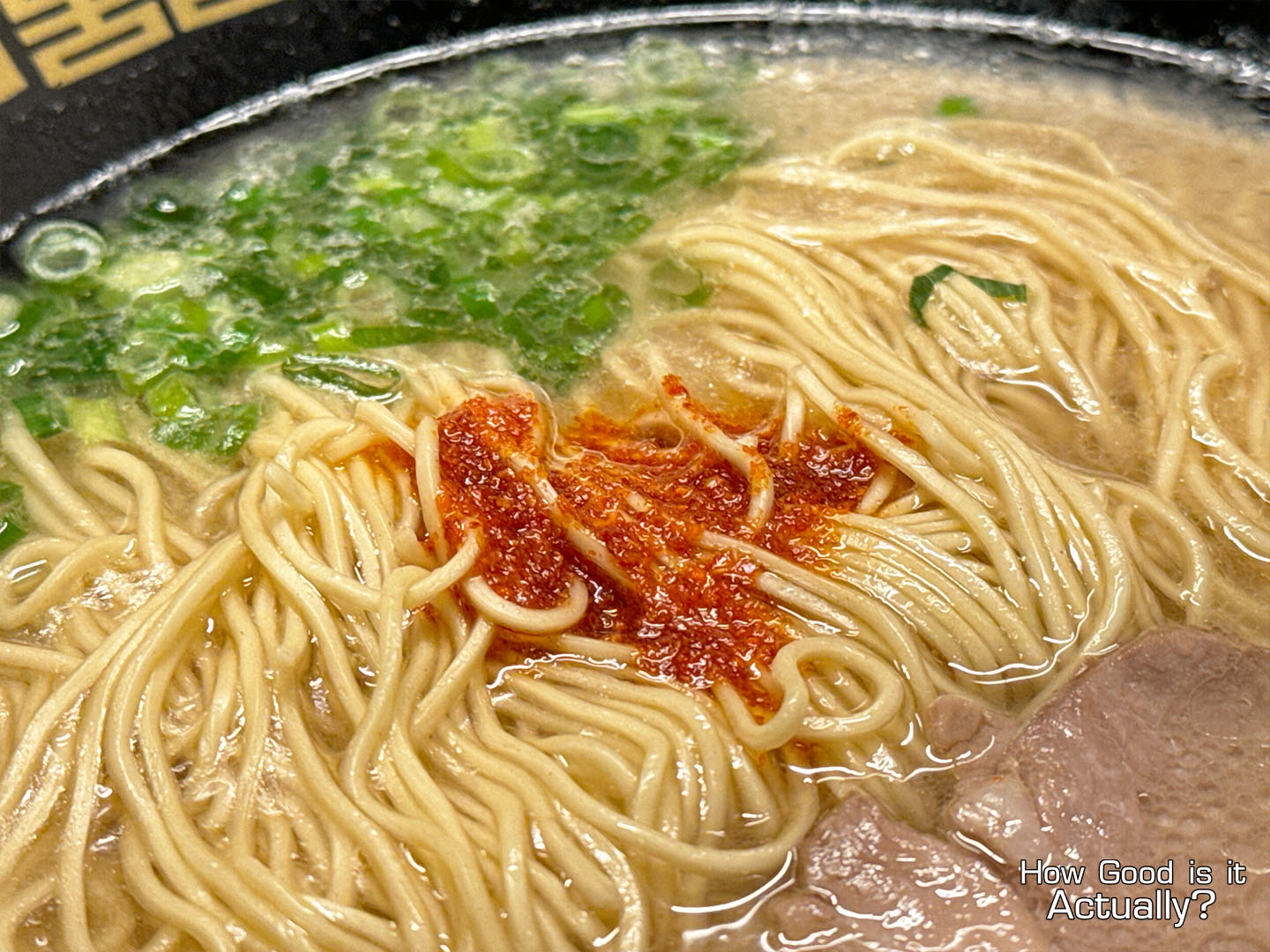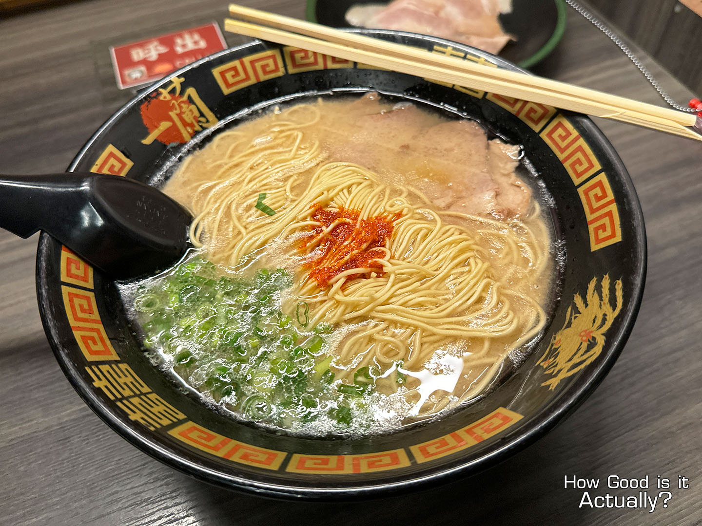 The presentation of Ichiran’s Classic Tonkotsu is quite striking. Green onions on one side, Chashu on the other, and in the center – Hakata-style noodles topped with their signature “Secret Red Sauce.”