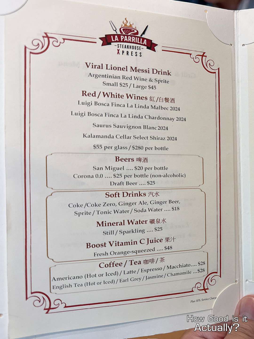 In addition to their courses, you’ll also find a selection of Wines, Beers, and the interesting “Viral Lionel Messi Drink” of Argentinian Red Wine and Sprite.
