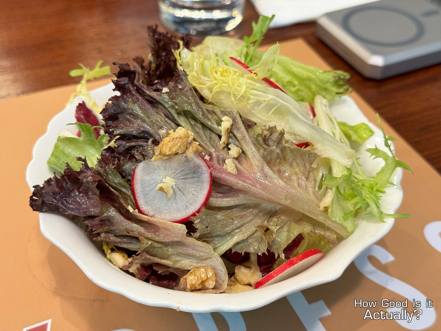 Starting with the salad – mixed greens, radish slices, and walnuts, tossed in a vinaigrette.