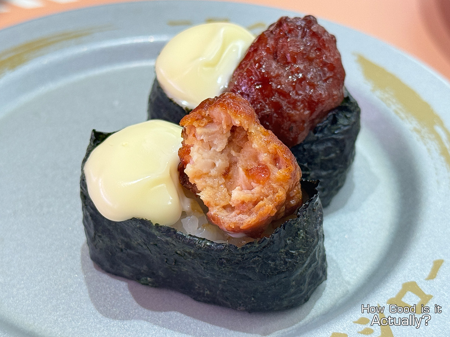 Chicken meatballs in a tomato-based glaze with some mayonnaise, served gunkan-style.