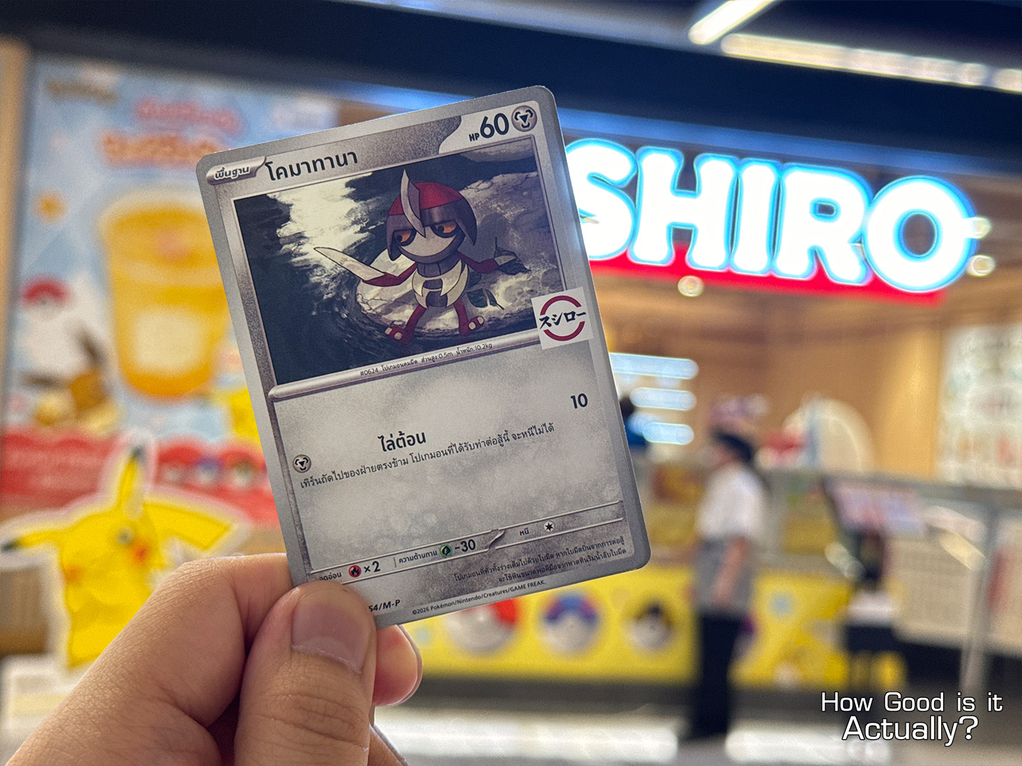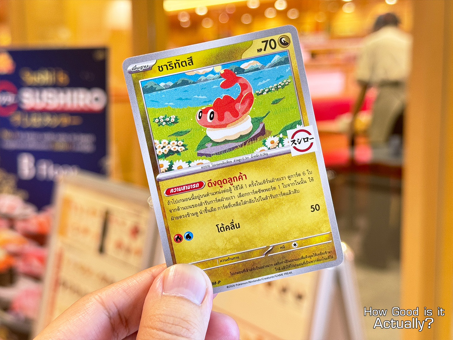 For every 500฿ spent, relay the secret code “ฉันเลือกซูชิโร่!” (“Sushiro, I choose you!” – though not exactly like how Ash says it) to the staff during checkout, and receive a random Pokémon TCG Promo Card, featuring:
