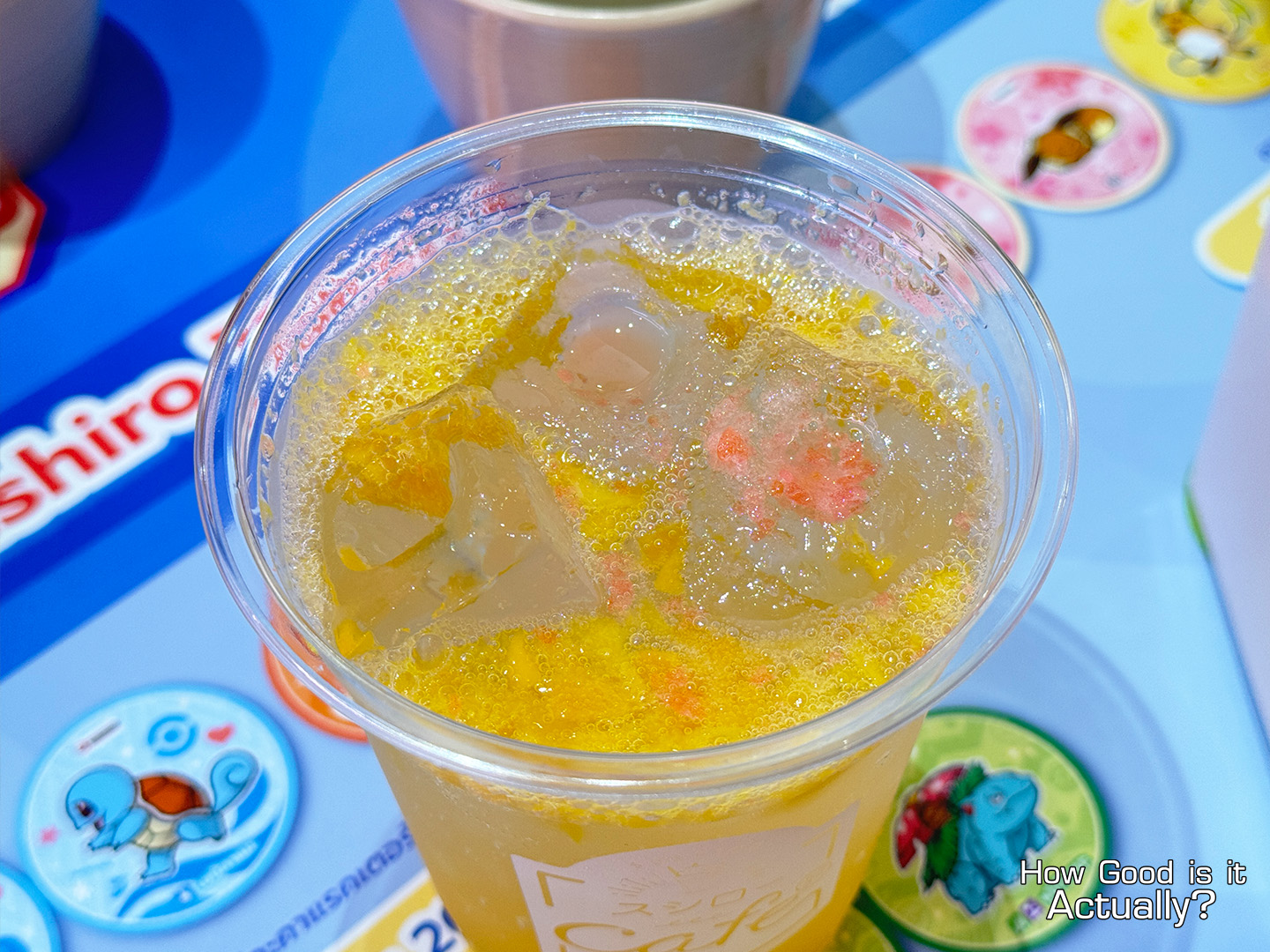 A Pikachu/Raichu-inspired drink – Fresh mango & pineapple syrup soda, topped with some popping candy.