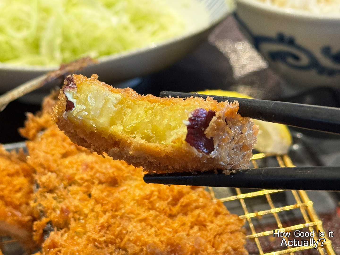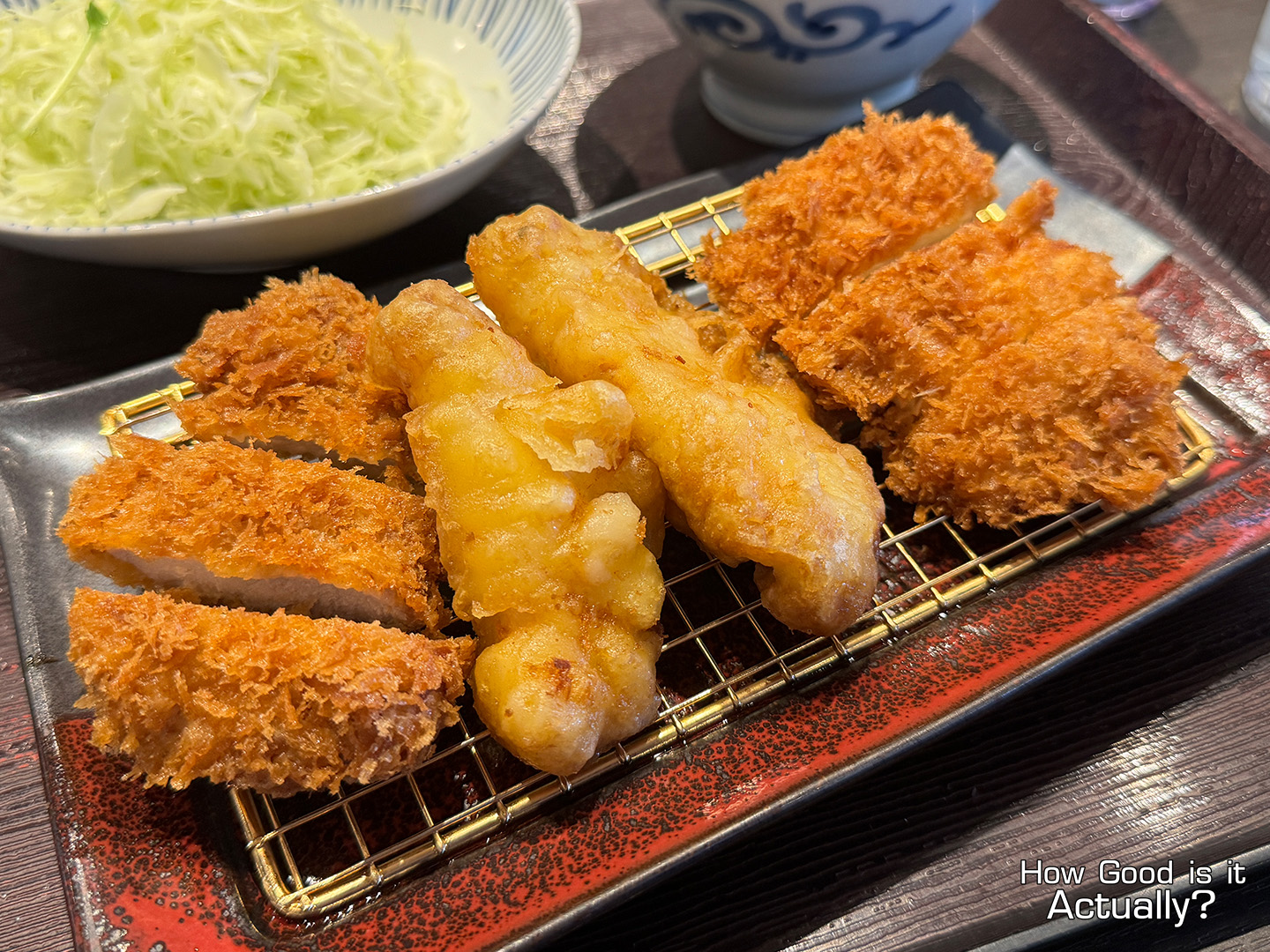 And with it being at the top of my wishlist this trip, this set was an easy choice, featuring a half-size Aji Fry, Chicken Katsu, and a seasonal vegetable katsu – sweet potato in today’s case.
