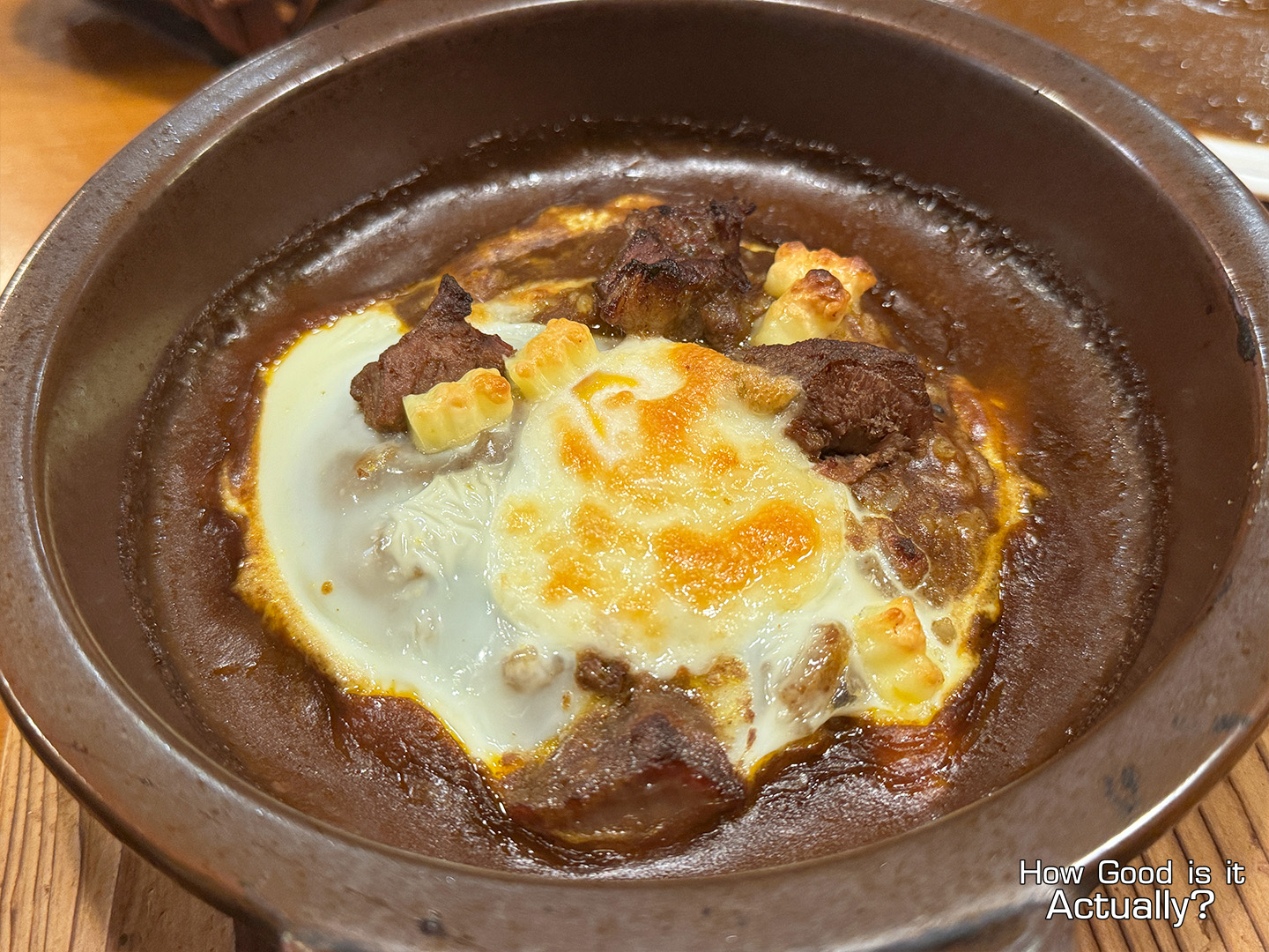 Topped with a baked egg, melty cheese, pull-apart beef cubes, and served on a hot plate, the end result is a very unique experience that’s sure to leave an impression!